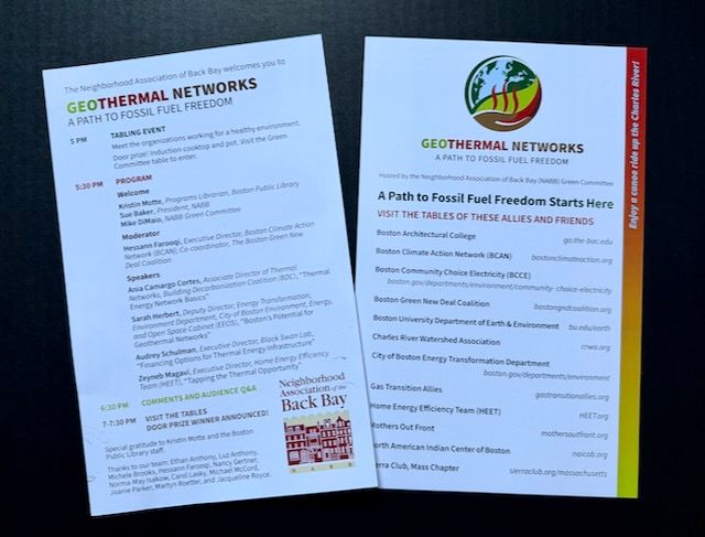 The Neighborhood Association of Back Bay’s Green Committee hosted a wonderful community event on April 22nd to mark Earth Day 2026 and energize the public about the potentials of geothermal energy. An array of local environmental organizations were on hand to answer questions and enlist support. The impressive roster of speakers included: Ania Camargo Cortes, Associate Director of Thermal Networks, Building Decarbonization Coalition (BDC); Sarah Herbert, Deputy Director, Energy Transformation, Environment Department, City of Boston Environment, Energy, and Open Space Cabinet (EEOS); Audrey Schulman, Executive Director, Black Swan Lab; and Zeyneb Magavi, Executive Director, Home Energy Efficiency Team (HEET).